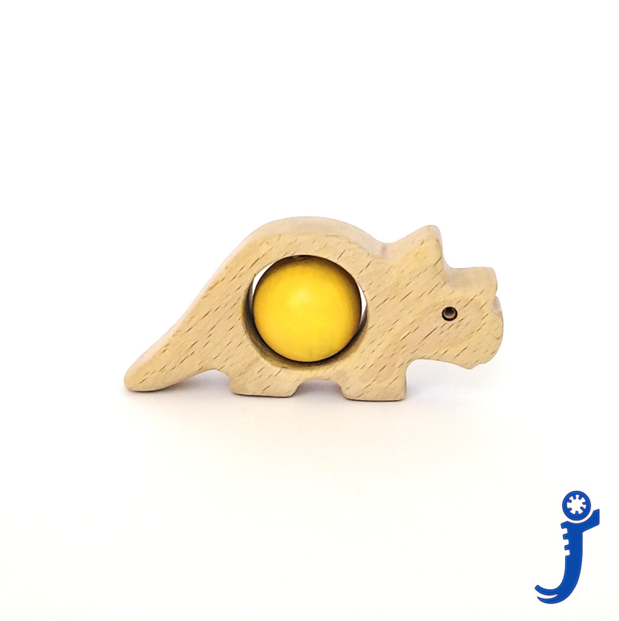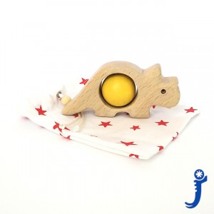 Zornaitoarea este perfecta pentru manutele mici si neindemanatice ale bebelusilor. Jucaria ii introduce in lumea fantastica, preistorica a dinozaurilor pe bebeexporatorii dumneavoastra. Lemnul, element natural, placut la atingere ofera copilului o experienta senzoriala aparte. Sunetul produs de bila din lemn nu este strident, puternic. Iar culoarea bilei este calda. Pe langa culoarea galbena din poza, zornaitoarea poate fi comandata si pe culoarea verde, roz sau albastra. Lemnul este tratat cu lac si vopsele certificate EN 73-1, sigure pentru a intra in contact cu pielea si saliva bebelusului. Deasemenea, lacul sigileaza suprafata lemnului, astfel incat sa nu permita dezvoltarea microorganismelor pe suprafata.