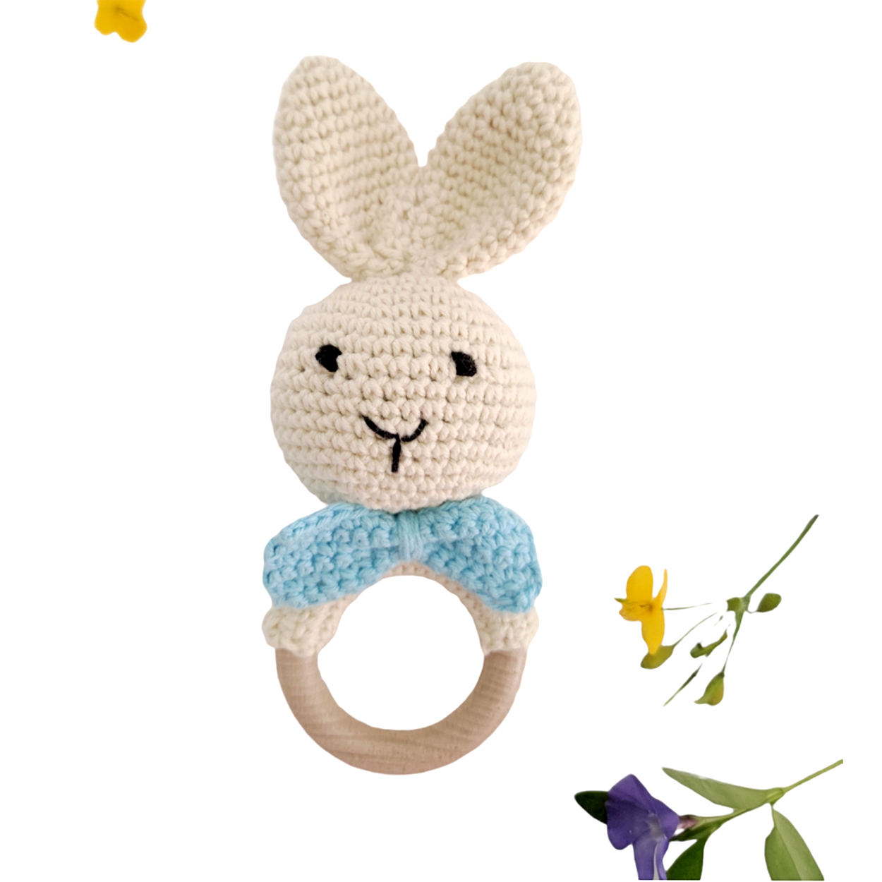 Jucaria de dentitie crosetata, cu inel de lemn, va incanta bebelusii inca de la prima atingere. Materialele naturale, placute la atingere, fac jucaria sigura pentru micutii nostri. Este formata din doua texturi diferite, bumbac mercerizat umplut cu umplutura hipoalergenica si lemn. Lemnul este lacuit cu lac ce respecta normele europene privind Siguranta Jucariilor EN 71-3, astfel ca porii lemnului sunt sigilati si impiedica dezvoltarea microorganismelor pe suprafata.